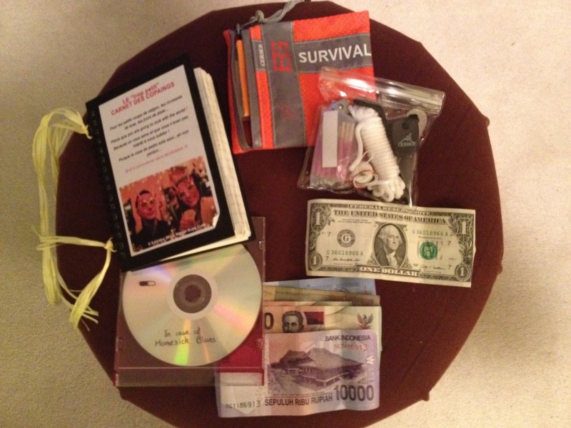 Content de savoir que vous ferez le trajet avec nous grâce à ce magnifique « trop petit » livre des copaings et cette B.O de l’amitié in case of Homesick Blues. On utilisera à bon escient ces 14 billets de 22 centimes qui feront également la richesse de notre voyage. Et on survivra, rassurez-vous, grâce à ce kit Survival de notre ami Bear Grylls, qui nous permettra de chasser la moufette et de faire cuire sa chair si savoureuse !